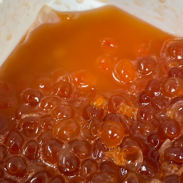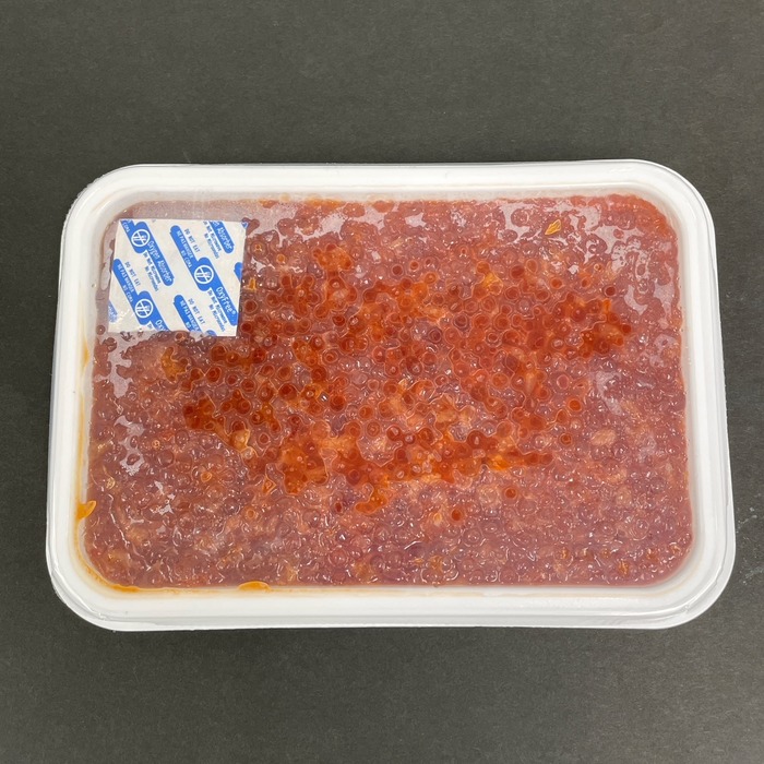 主原料: 鱒卵、醤油、植物蛋白加水分解物、ぶどう糖果糖液糖、かつお節エキス、発酵調味料、砂糖、食塩、調味料(アミノ酸等)、ph調整剤、(原材料の一部に小麦、いくら、大豆を含む)