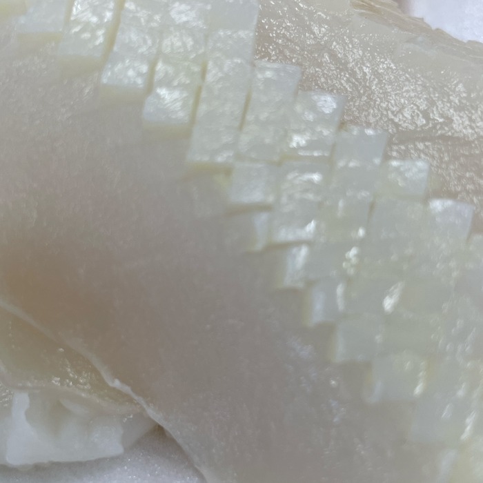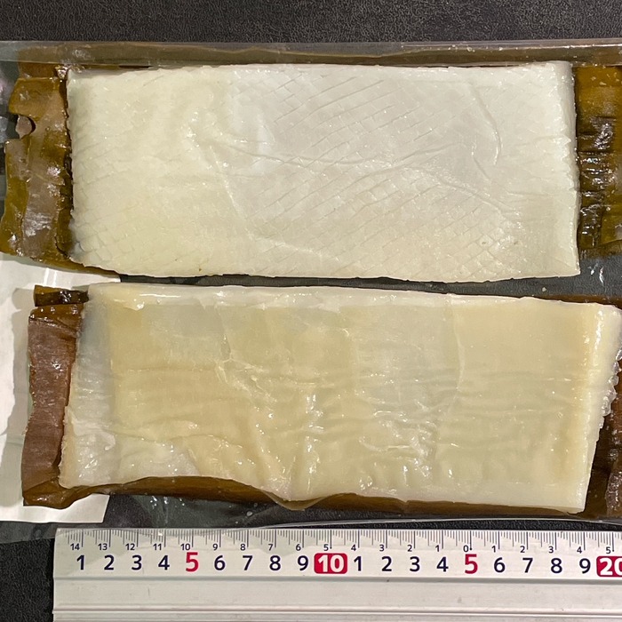 重量は画像のものでイカ(280g)昆布(40g)で、イカの皮目に格子状の切れ込みが入ってます。